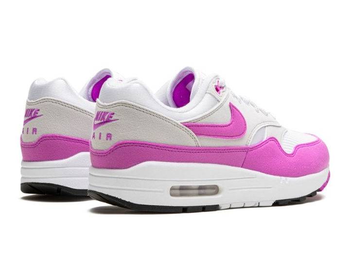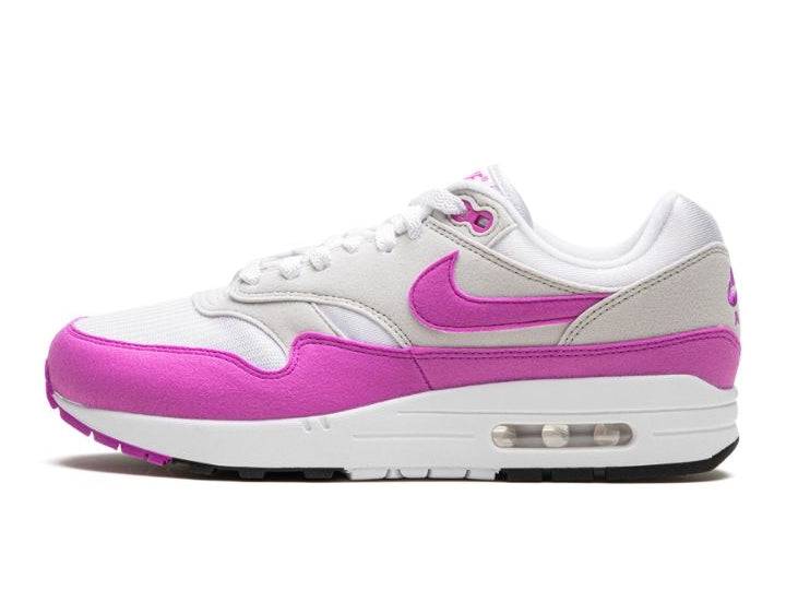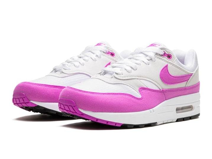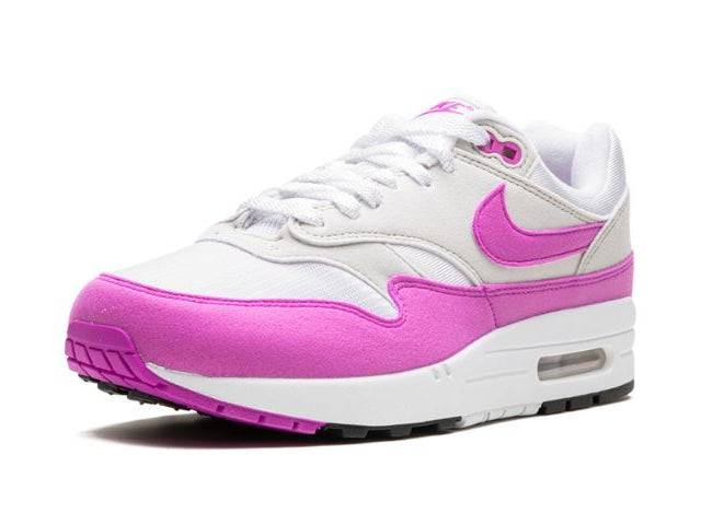 La Nike Air Max 1 « Fuchsia Dream » pour femme est un coloris exclusif pour femmes de la chaussure de course rétro performante avec des accents agréables à regarder. La tige présente une base en maille blanche avec du daim gris sur les superpositions. Un Swoosh de couleur Fuchsia Dream apparaît de chaque côté. D'autres accents Fuchsia Dream sont visibles sur le garde-boue, sur la marque « Nike Air » sur l'étiquette du talon et de la languette, ainsi que sur les œillets supérieurs. Sous le pied, une unité Air visible dans le talon de la semelle intermédiaire en mousse blanche complète le look.