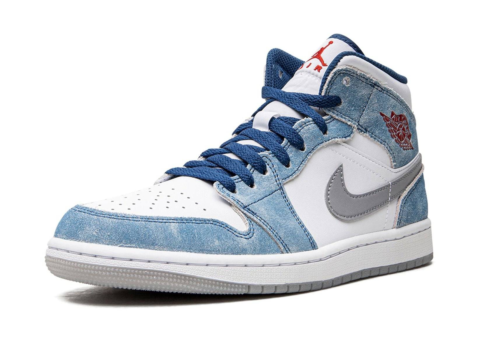 - Design: Mid-top silhouette with distressed blue overlays, grey Swoosh and red branding