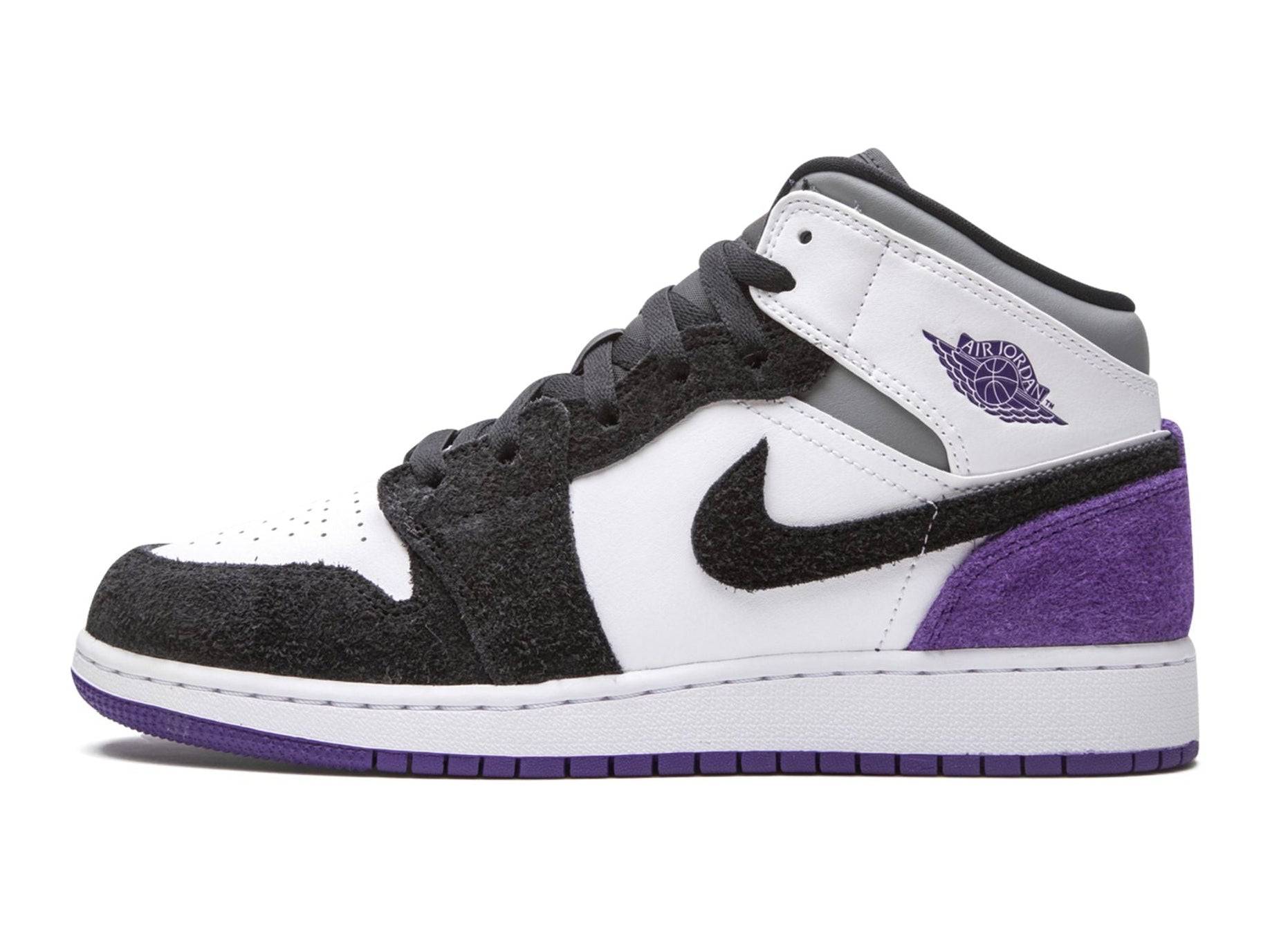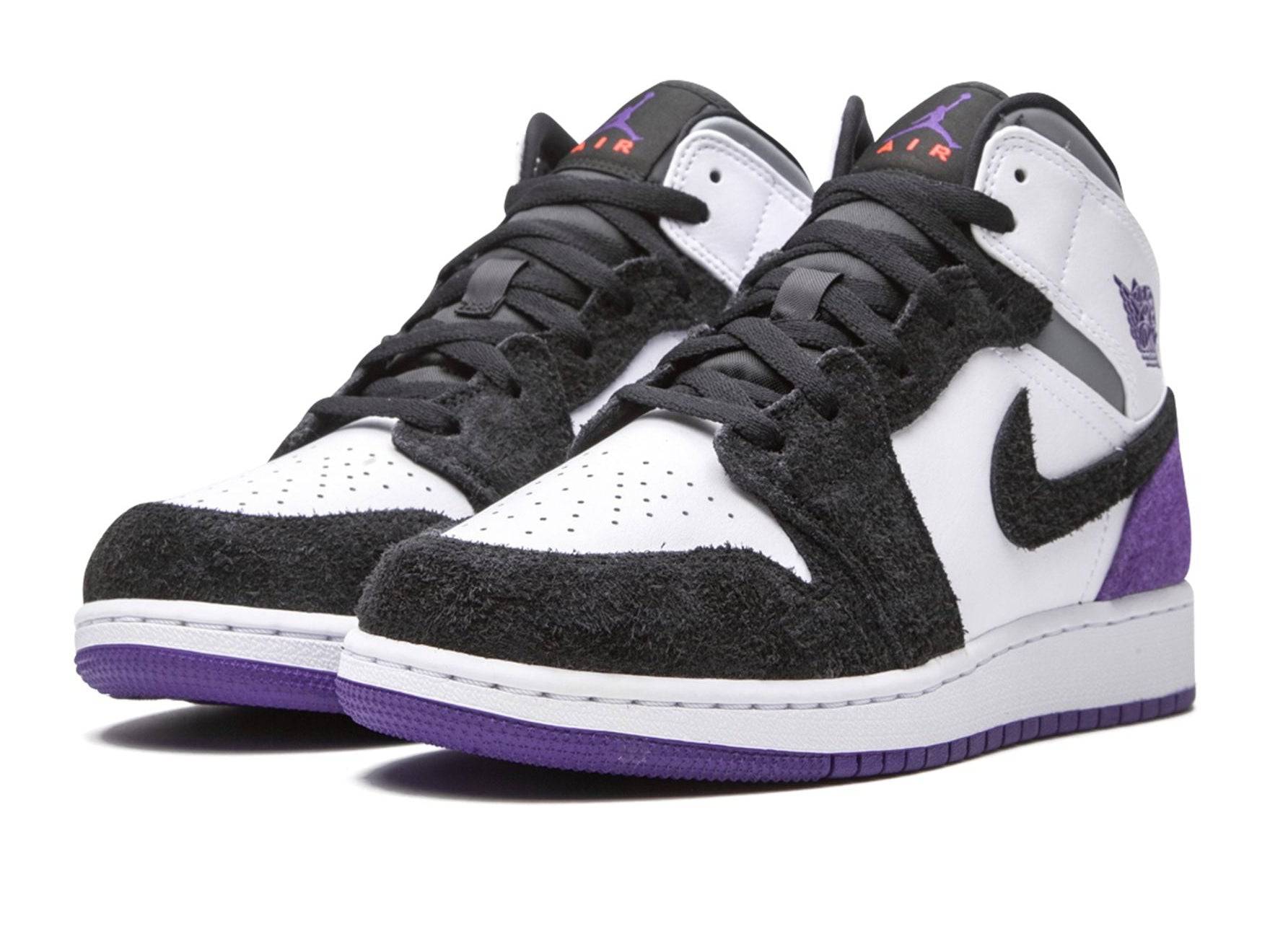 - Design: Mid-top silhouette with contrasting panels and purple accents