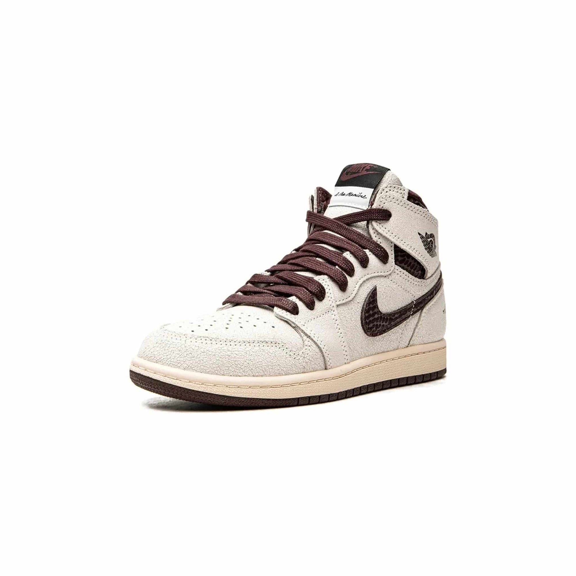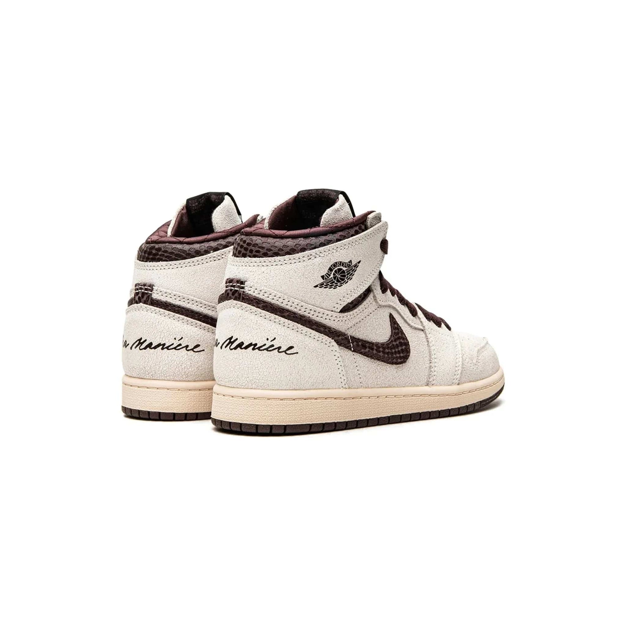 The off-white suede overlay contrasts starkly with the deep burgundy accents on the laces, lining, and that unique snakeskin Swoosh. A subtle detail? The stitched "A Ma Maniére" branding on the heel adds some extra character to this collab. The combination of premium materials and high-end finishing makes this not just a kids' shoe, but a mini statement piece.