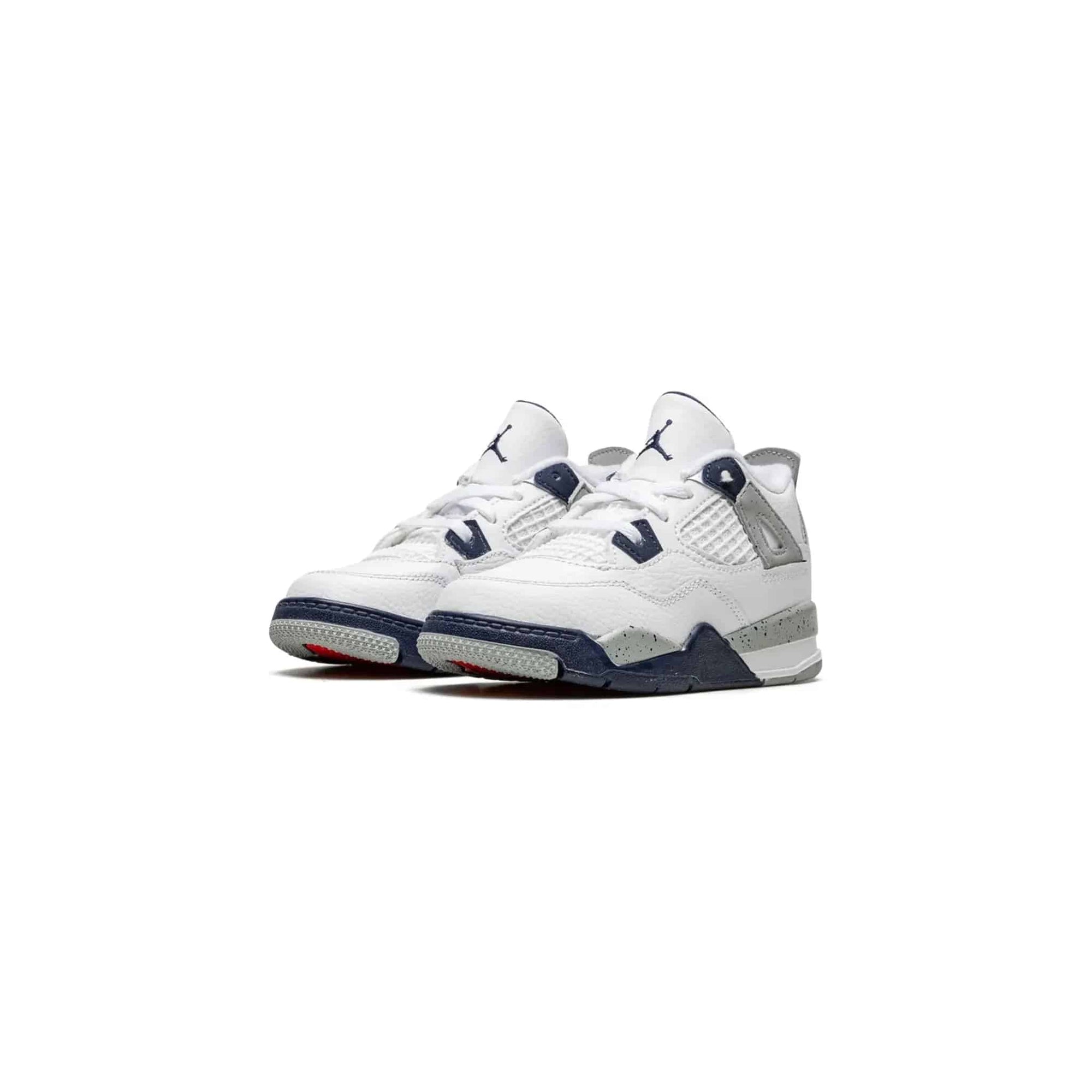 The Air Jordan 4 Retro Midnight Navy (TD) brings legendary Jordan vibes to a smaller size — perfect for the youngest sneakerheads. This mini version of the iconic AJ4 mixes retro basketball DNA with modern street appeal, all in a timeless color scheme of white, navy, and cement gray.