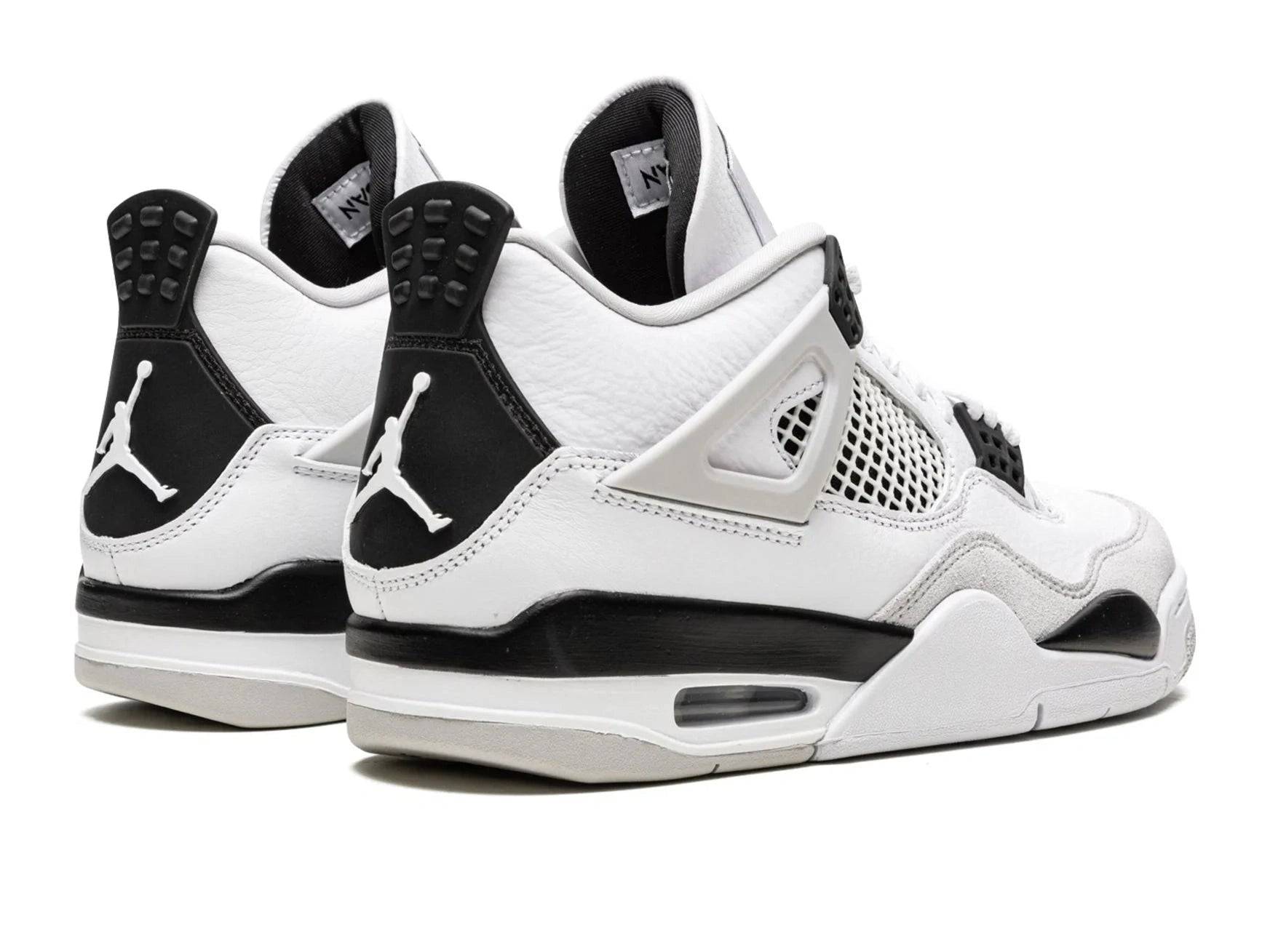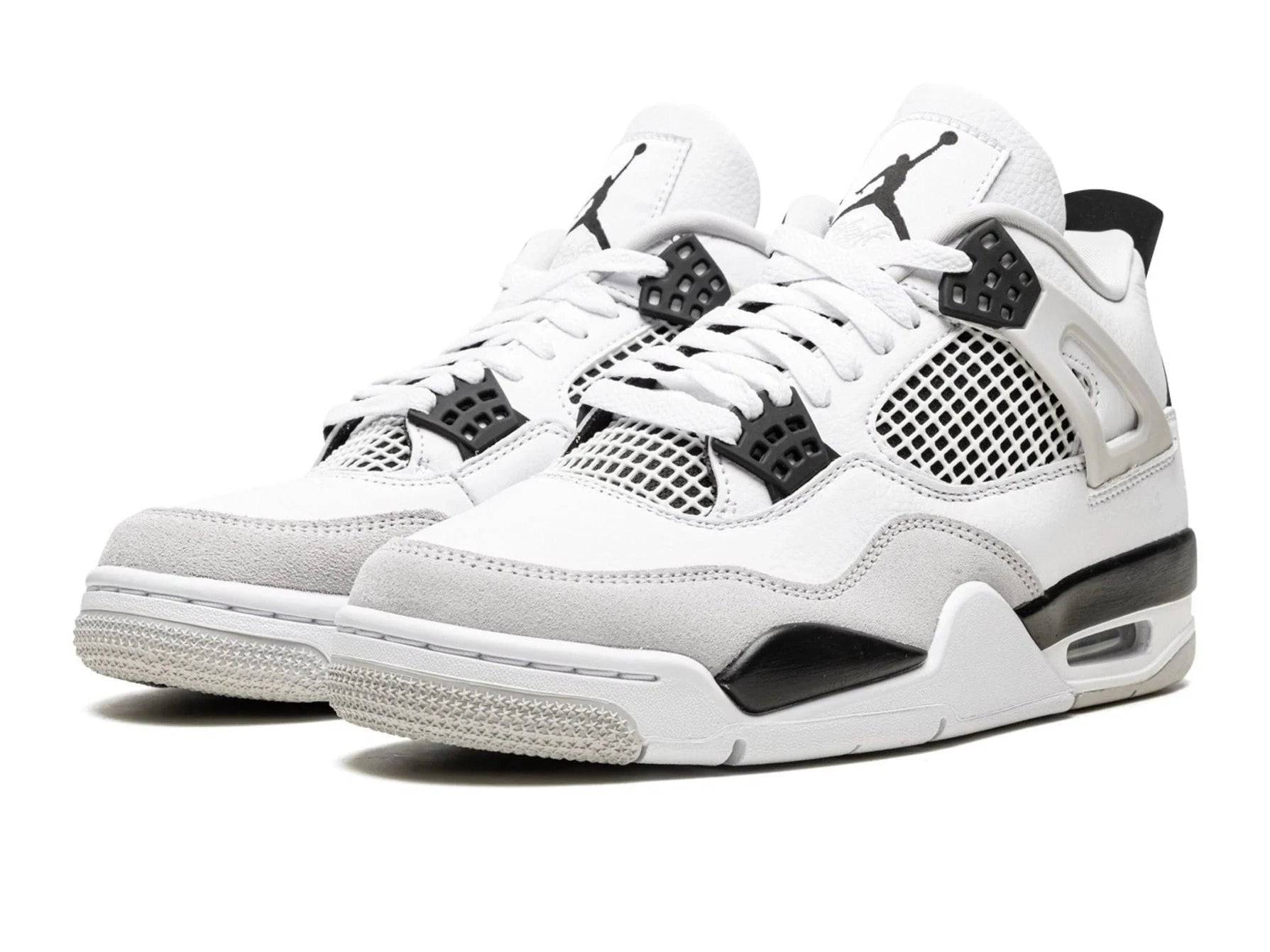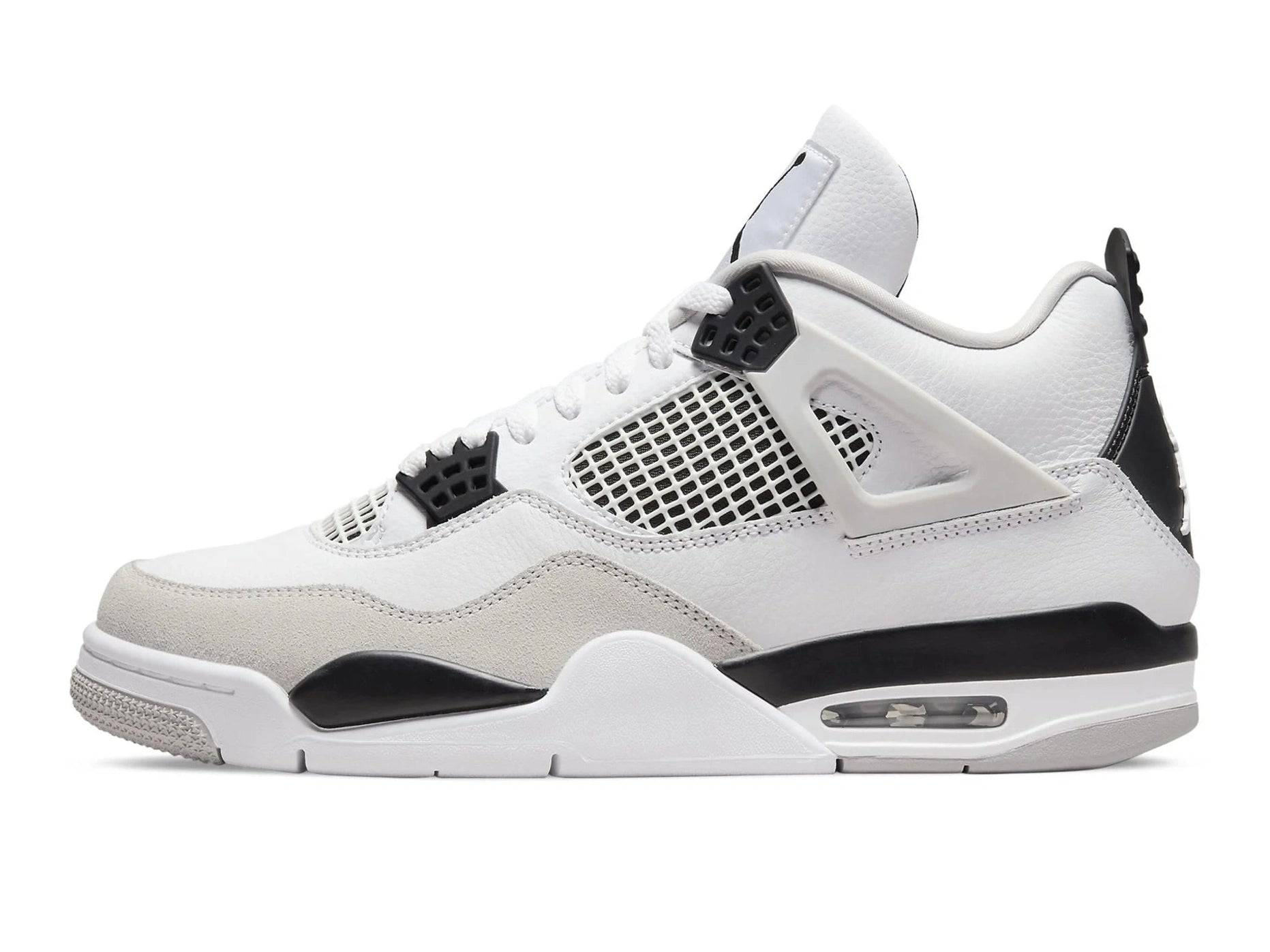 The upper is constructed using a mix of premium white leather and light grey suede overlays — perfectly paired with black accents on the eyelets, heel tab, and netting. A visible Air unit in the outsole provides comfort you’ll feel with every step, whether you’re hitting the streets or fronting your favorite drop. What makes this release truly unique? A fresh Military Black colorway making its debut on the iconic AJ4 silhouette.