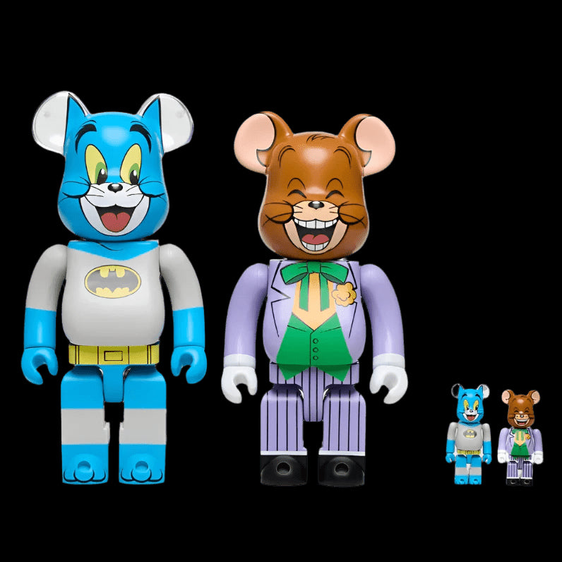Introducing the limited edition Bearbrick x Tom As Batman & Jerry As The Joker 100% & 400% Set. Collaborating with Warner Bros., these collectible figures feature your favorite cartoon duo transformed into iconic superheroes and villains. With a vibrant design and a collectible box set, this is a must-have for all fans and collectors.