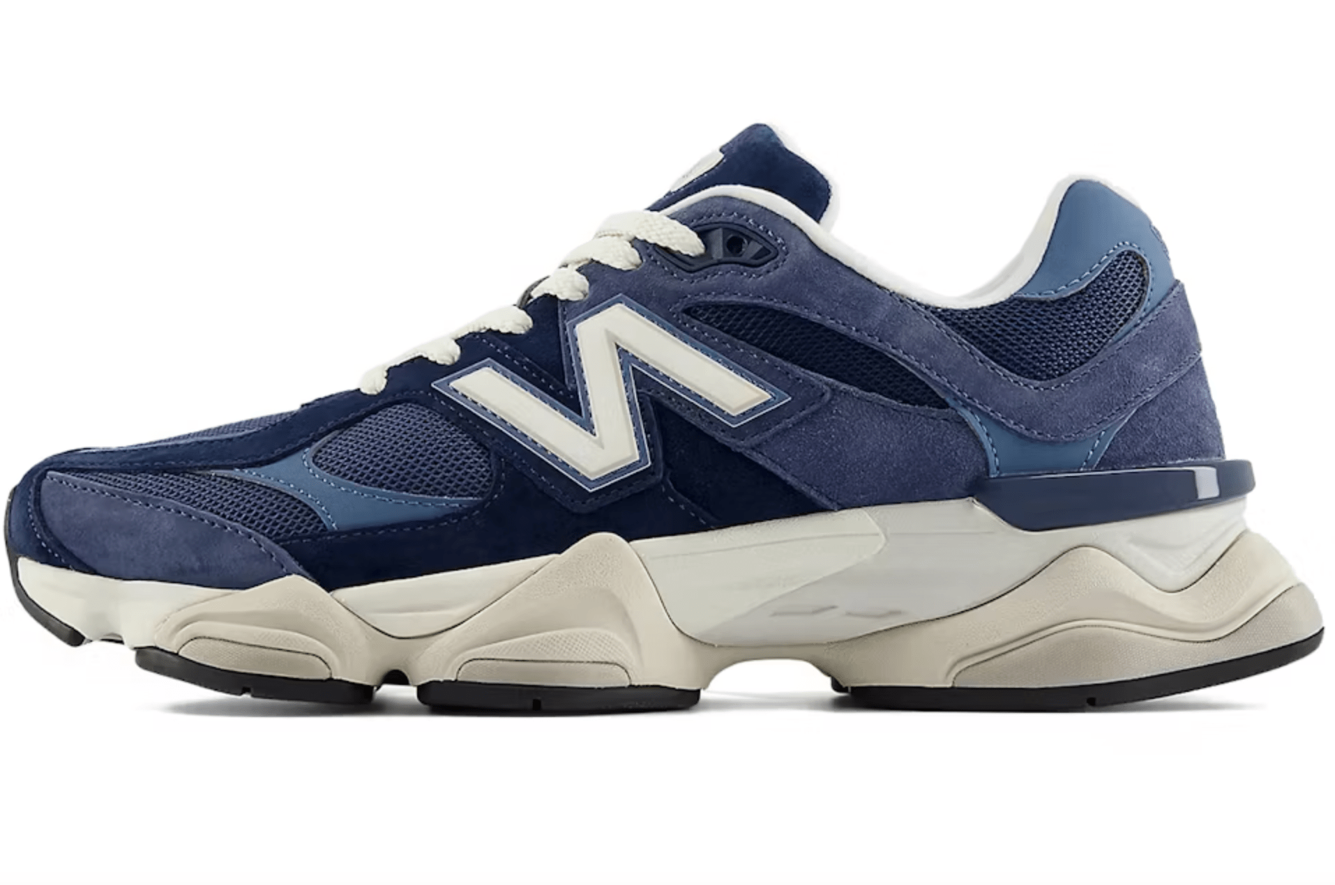 What makes this 9060 truly unique is the oversized "N" branding and the asymmetrical design that literally breaks with tradition. The color palette - a blend of Vintage Indigo, Heron Blue and off-white - makes these kicks a stylish match with both baggy jeans and techwear fits.