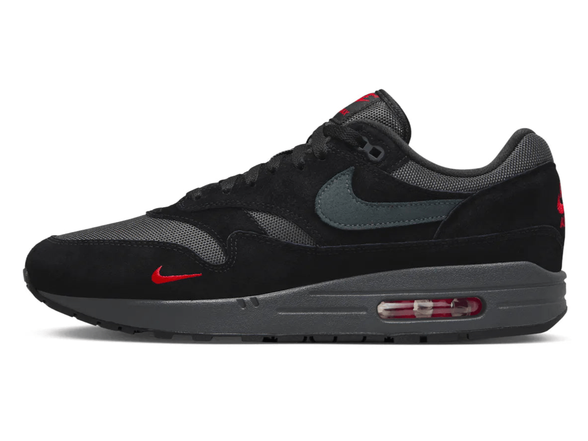 The Nike Air Max 1 Anthracite Bred mixes old-school design with a dark grey, almost stealthy vibe and bright red details that immediately stand out. This colorway is all about contrast: a black suede upper, combined with mesh panels in anthracite, and a red Mini Swoosh that comes across as a visual punch. A shoe with attitude, without being flashy.