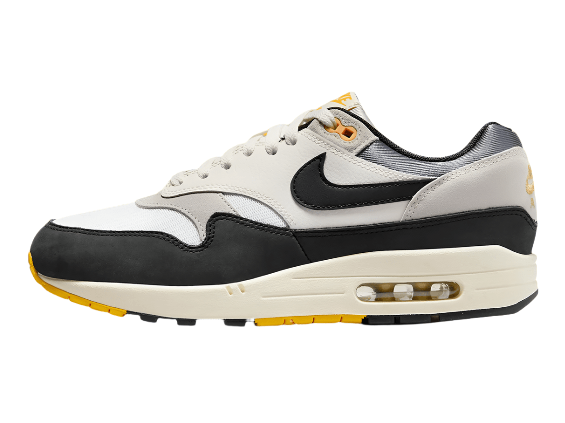 The Nike Air Max 1 Athletic Department combines classic OG vibes with fresh academic style, perfect for the sneakerhead who loves heritage with a modern twist. This colorway mixes neutral tones like off-white, black and light grey with striking yellow accents on the eyestays, tongue branding and outsole. The result? A sneaker detail that immediately catches the eye without being overpowering.