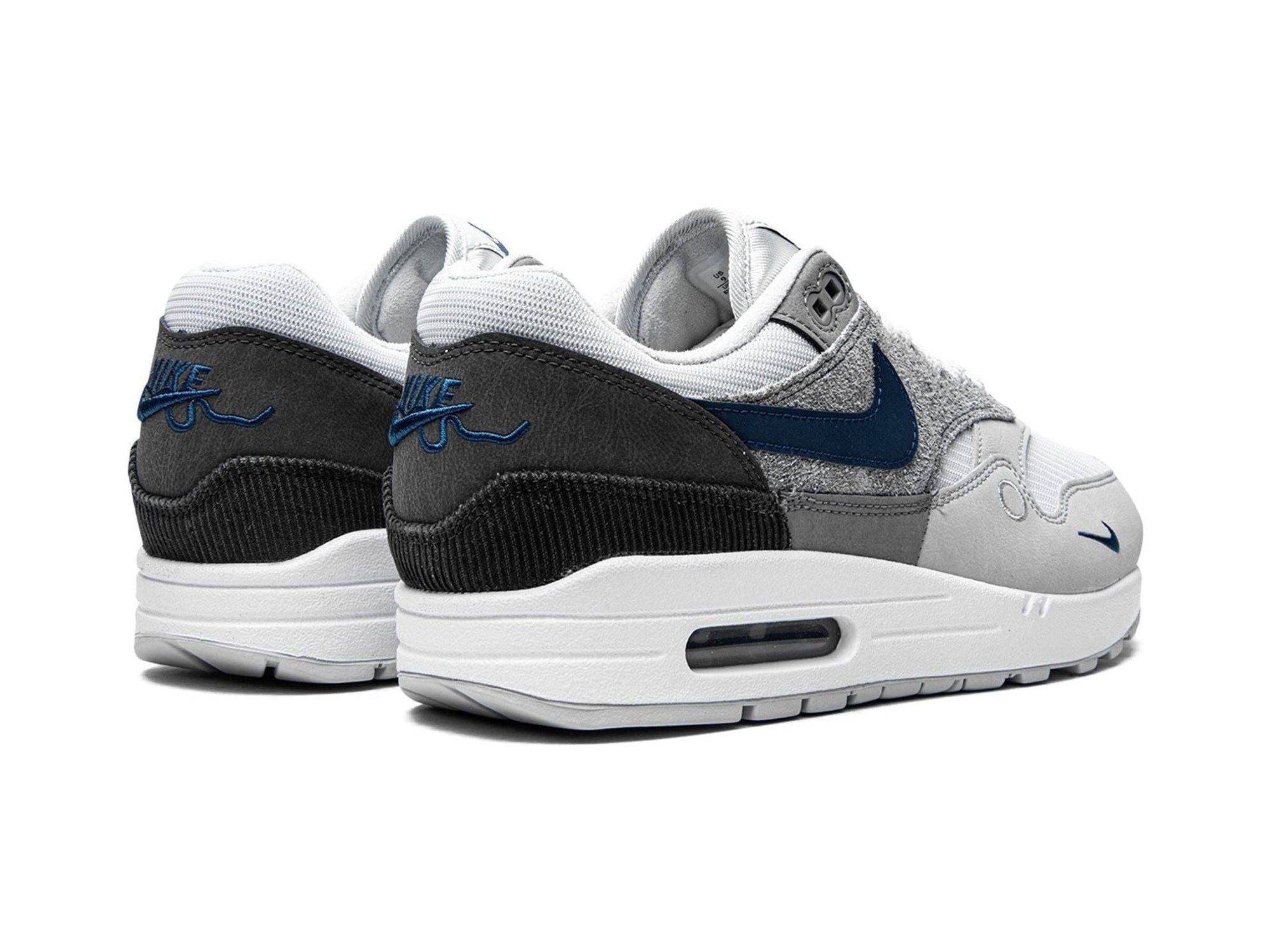 The upper combines soft suede, mesh and smooth leather in layered shades of grey with a deep blue-grey Swoosh. A tonal embroidery featuring the shape of the Thames adorns the heel — a unique detail that makes this AM1 instantly recognizable. A visible Air unit in the outsole provides the signature cushioning that the line has been famous for since '87.