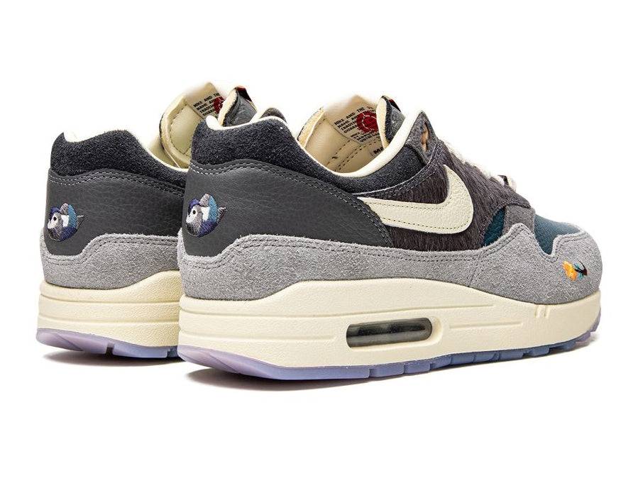 The colorway mixes warm grey tones with deep blue and cream accents, inspired by the South Korean 'Won-Ang' mandarin duck - a symbol of love and loyalty. Unique details like the subtle duck embroidery on the front, the combination of premium suede, textured leather and pony hair, give this Air Max 1 a luxurious look.