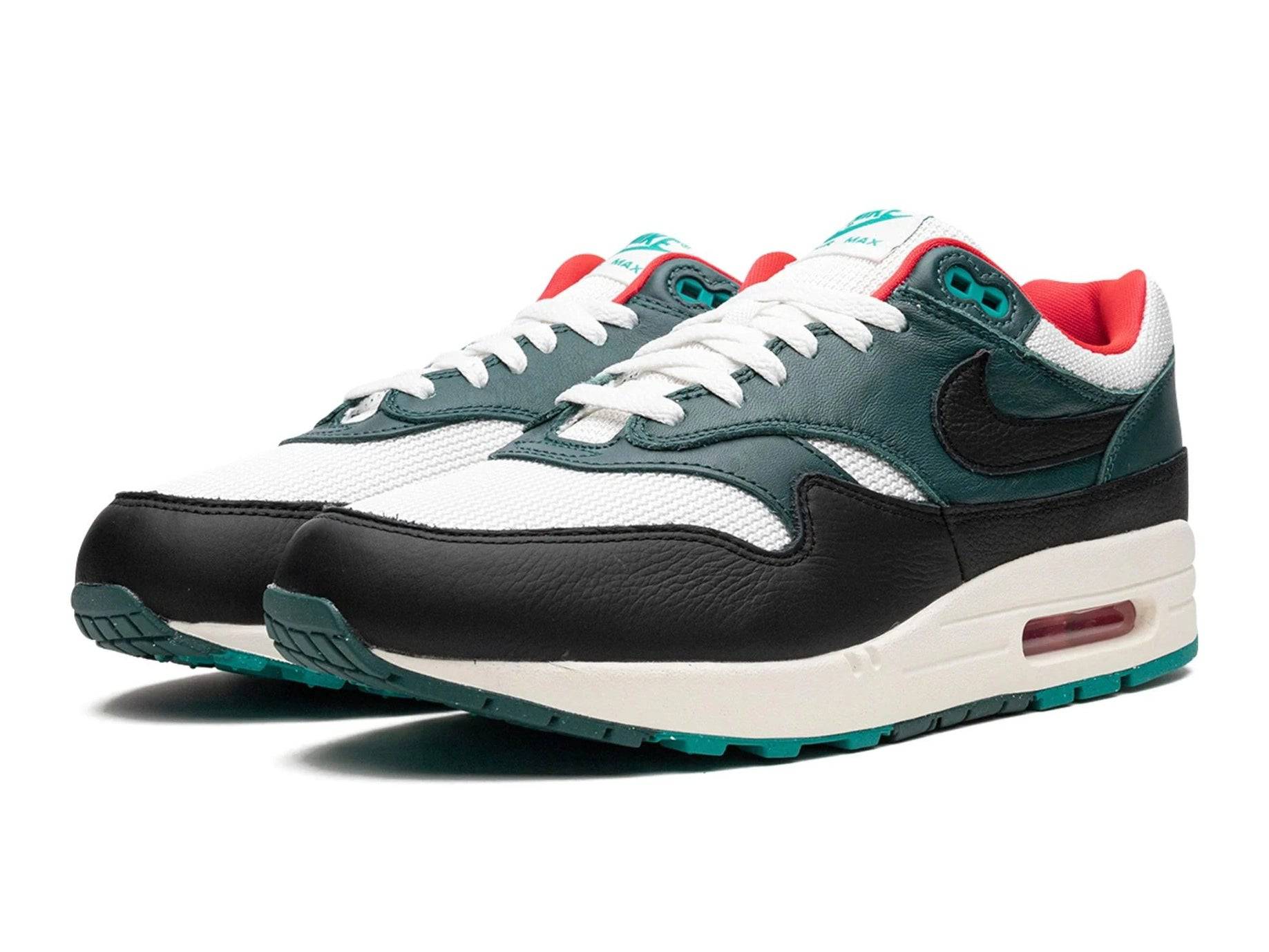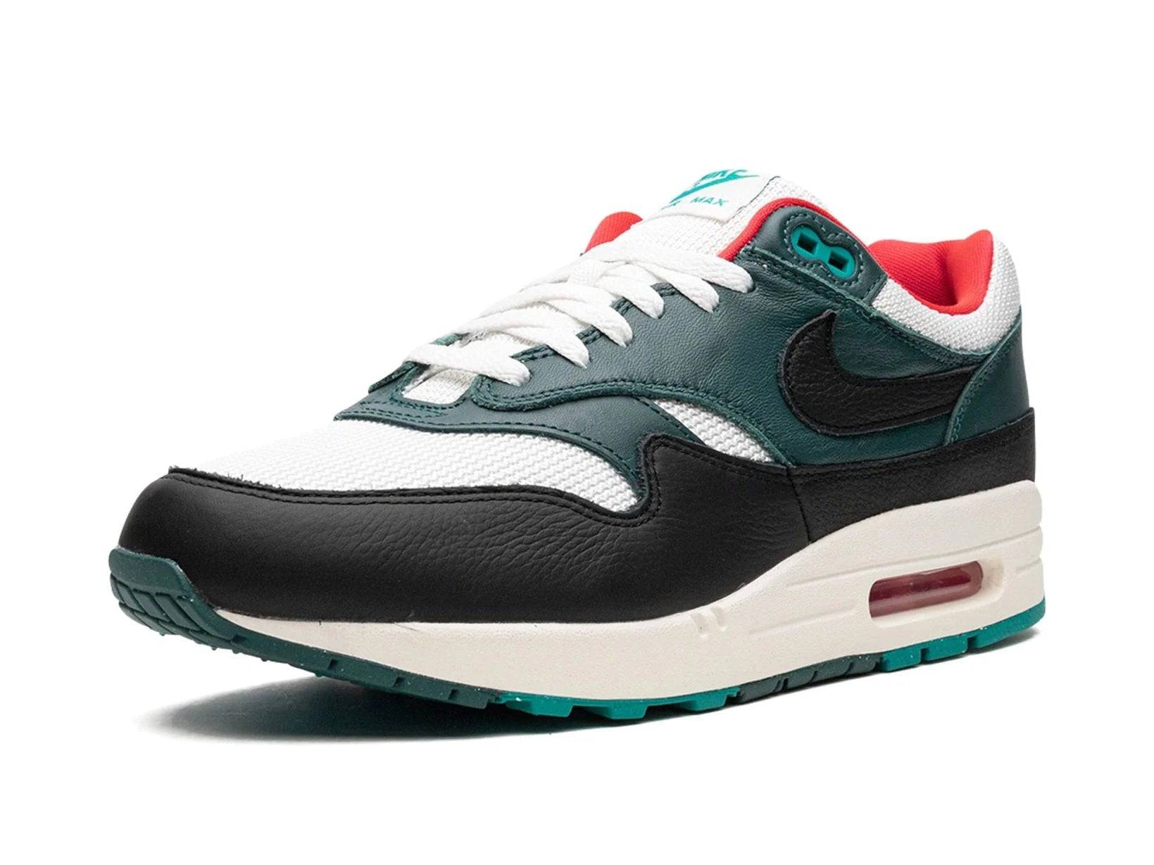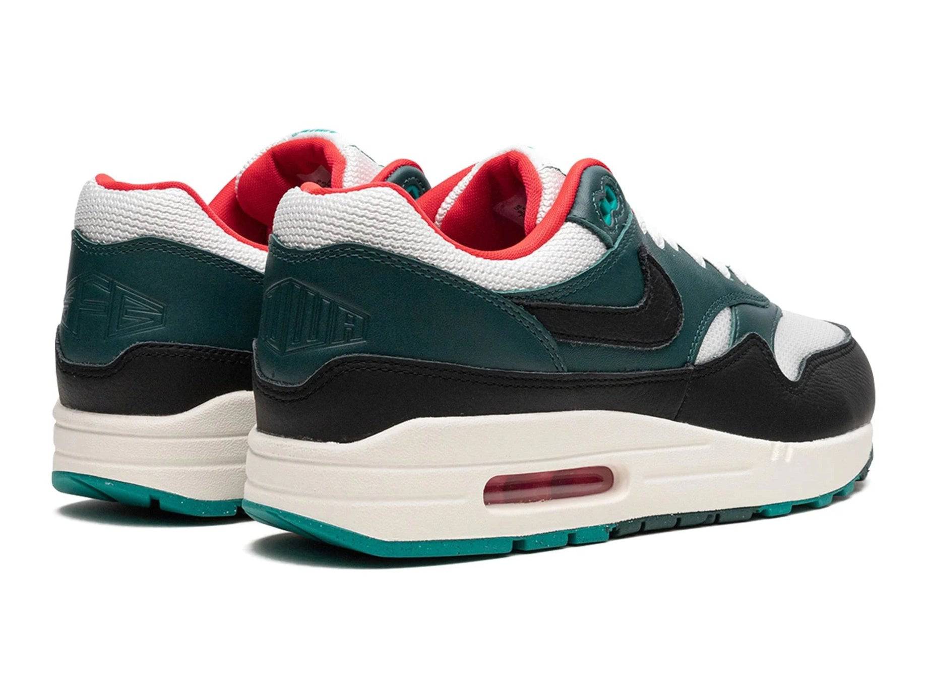 The upper combines premium white mesh with black and dark green leather, finished with striking red accents on the lining and lace eyelets. The fresh color combo is a subtle nod to Liverpool's historic club colors. The classic Air Max 1 vibe continues with the visible Air unit in the heel and a retro running silhouette. An additional unique detail: the iconic Liverbird logo is embossed on the heel.