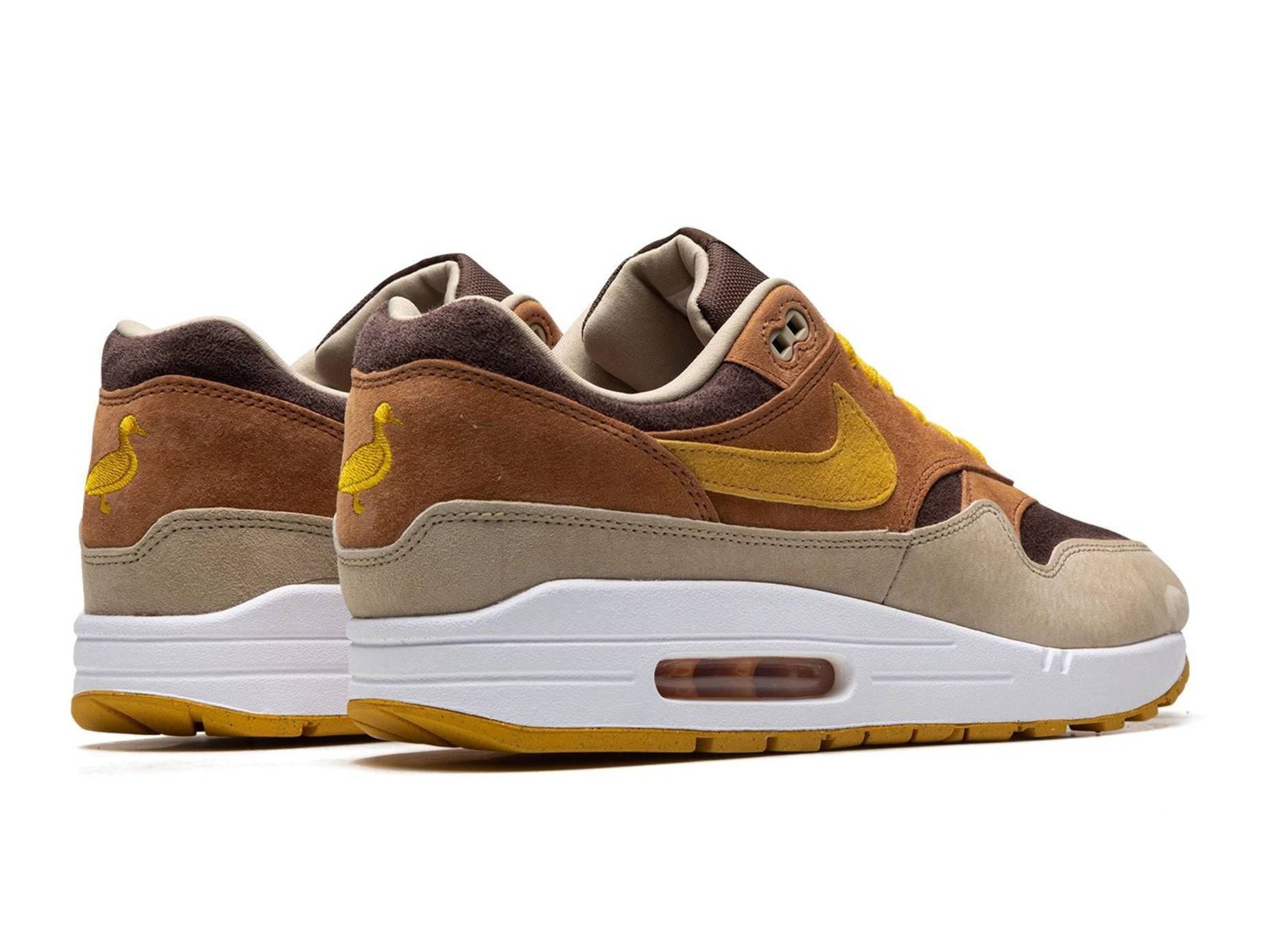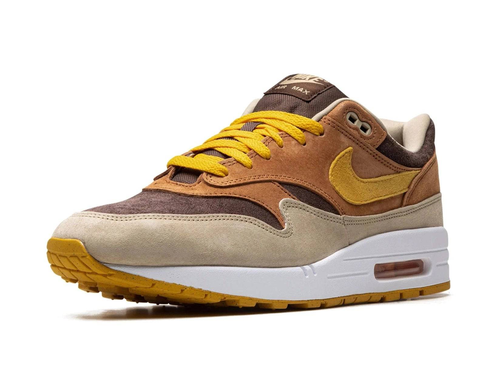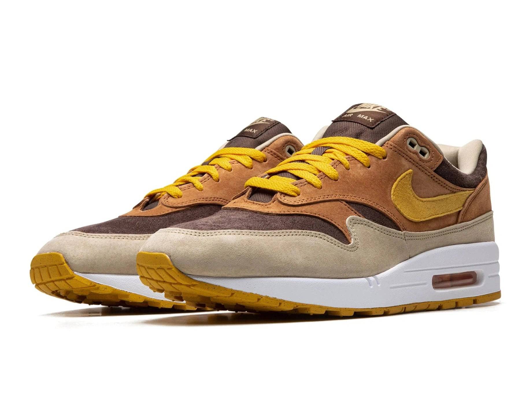 The Nike Air Max 1 Pecan Yellow Ochre mixes retro running vibes with earthy, luxury tones. This classic gets a warm fall update with rich suede overlays in pecan brown, beige and deep chocolate, paired with a bold yellow Swoosh and laces for that vintage-meets-street look.