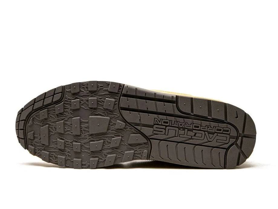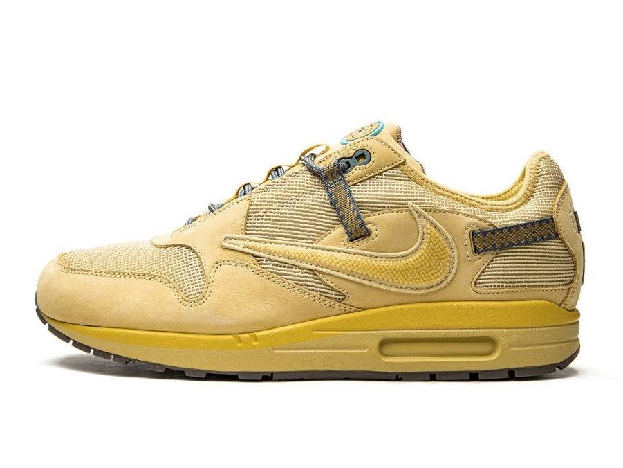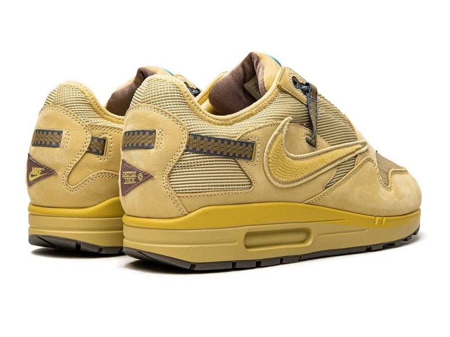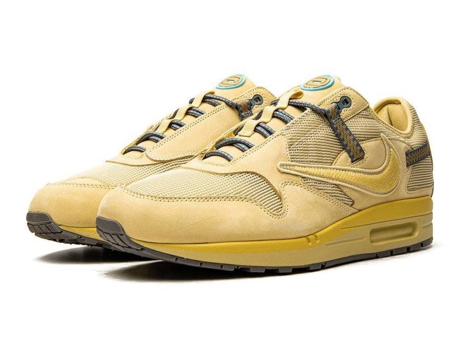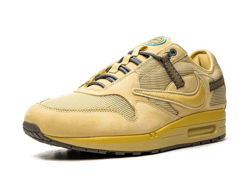 The upper is constructed from premium mesh and suede in warm Saturn Gold tones, which feel both luxurious and urban. The signature reversed Swoosh on the side immediately sets the tone: this is no ordinary AM1. Reflective details, chunky lace loops and technical stitching create an outdoors-meets-streetwear feel that fits perfectly with Travis Scott's style DNA.