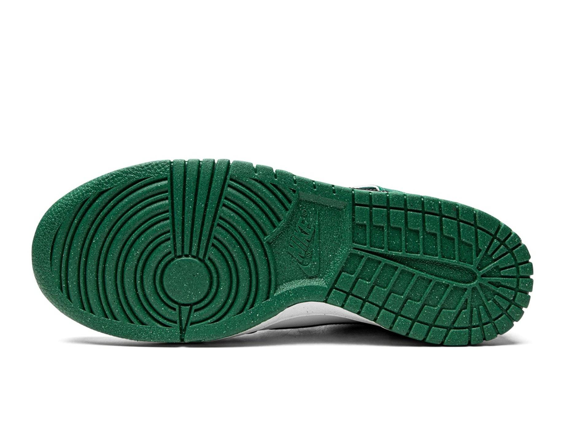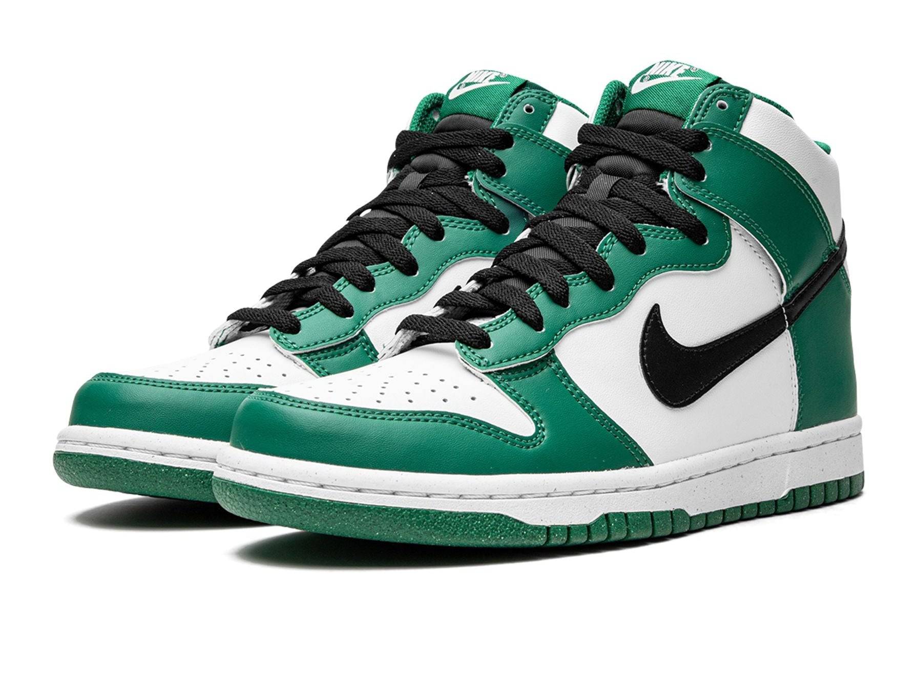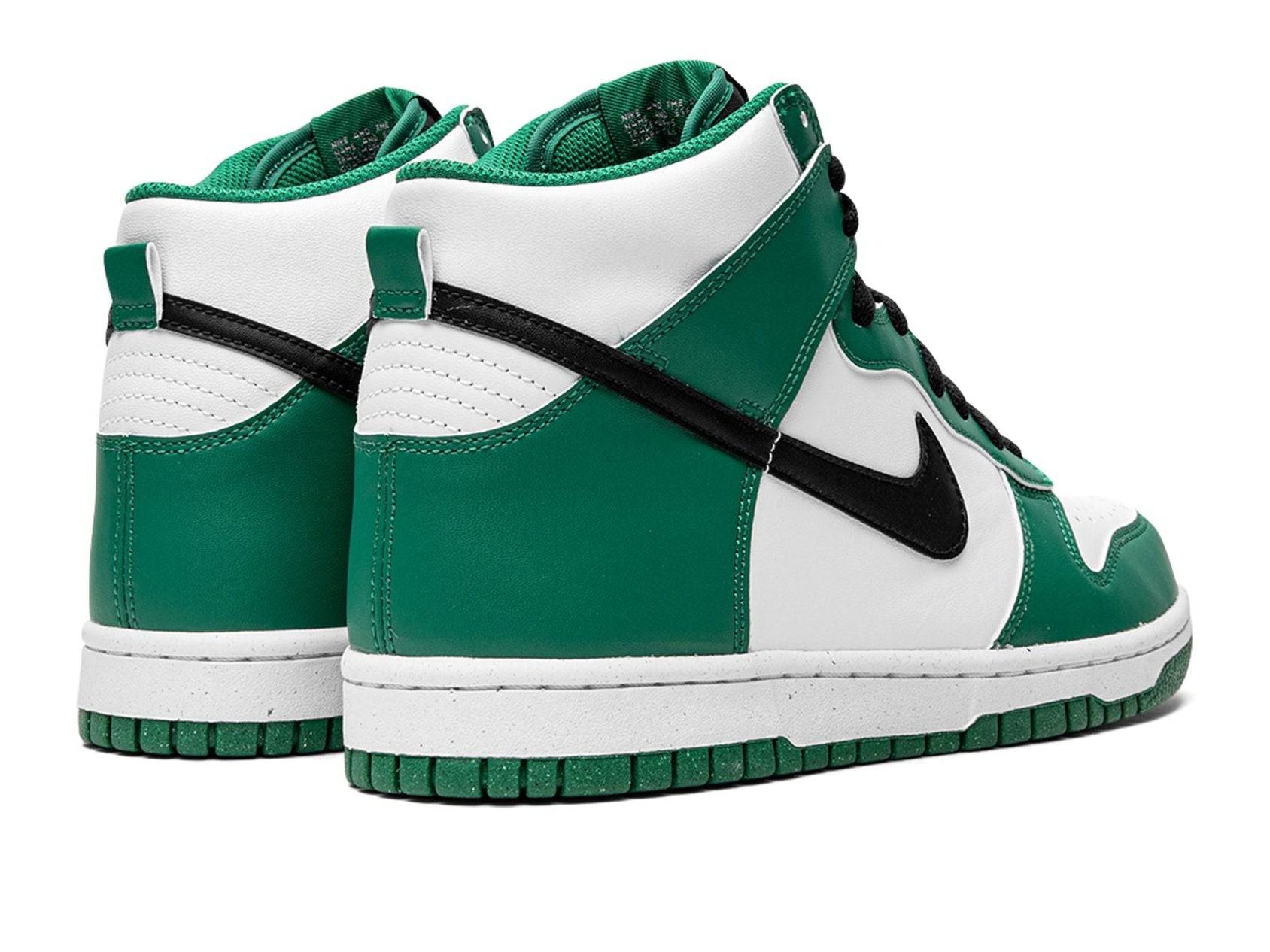 The Nike Dunk High Celtics brings back the classic basketball DNA of the '80s with a fresh streetwear vibe that fits perfectly with today's sneaker style. This high-top makes an immediate impression with deep green overlays, a crisp white base and contrasting black Swoosh — a color palette reminiscent of the legendary Boston Celtics.