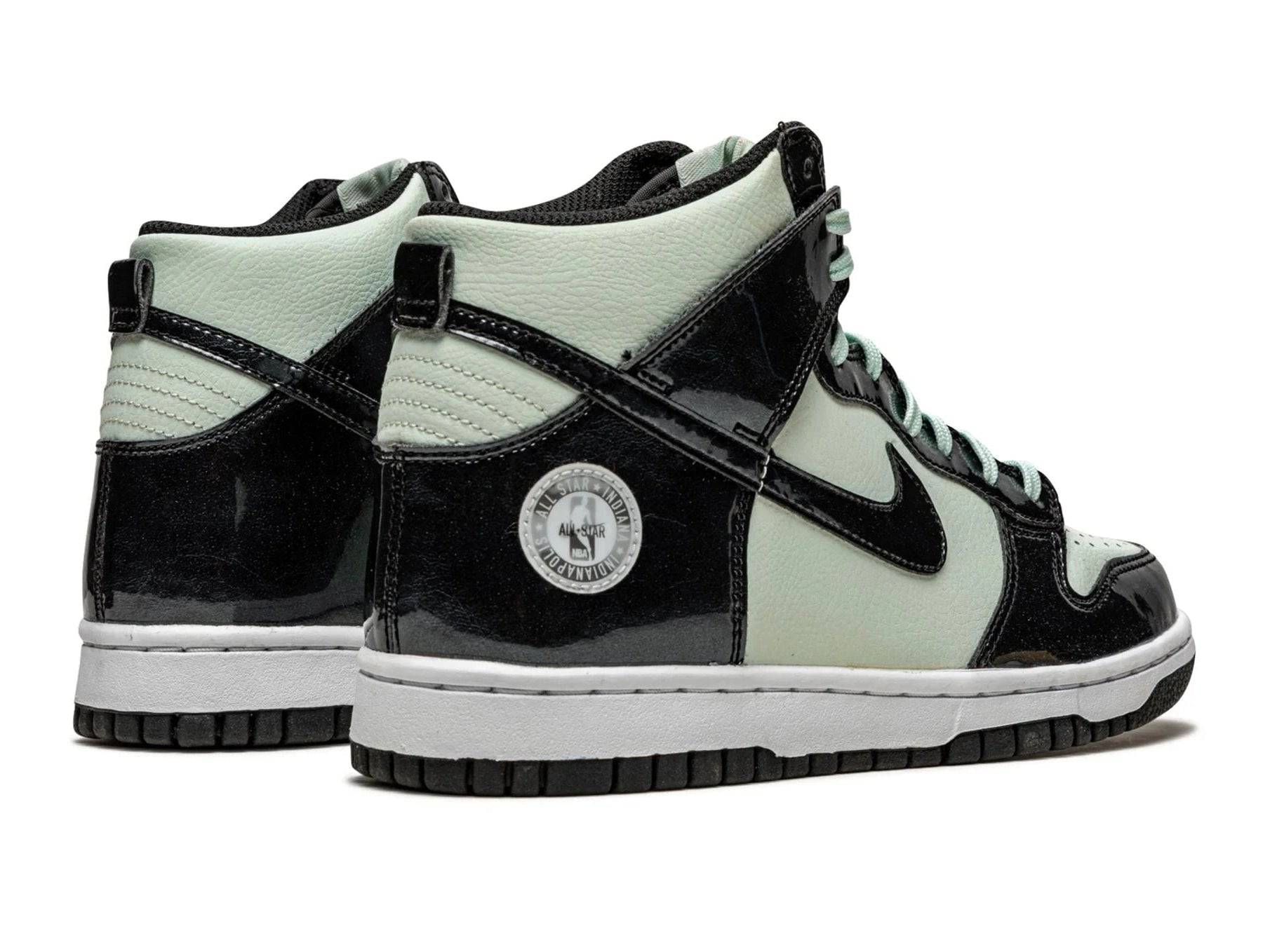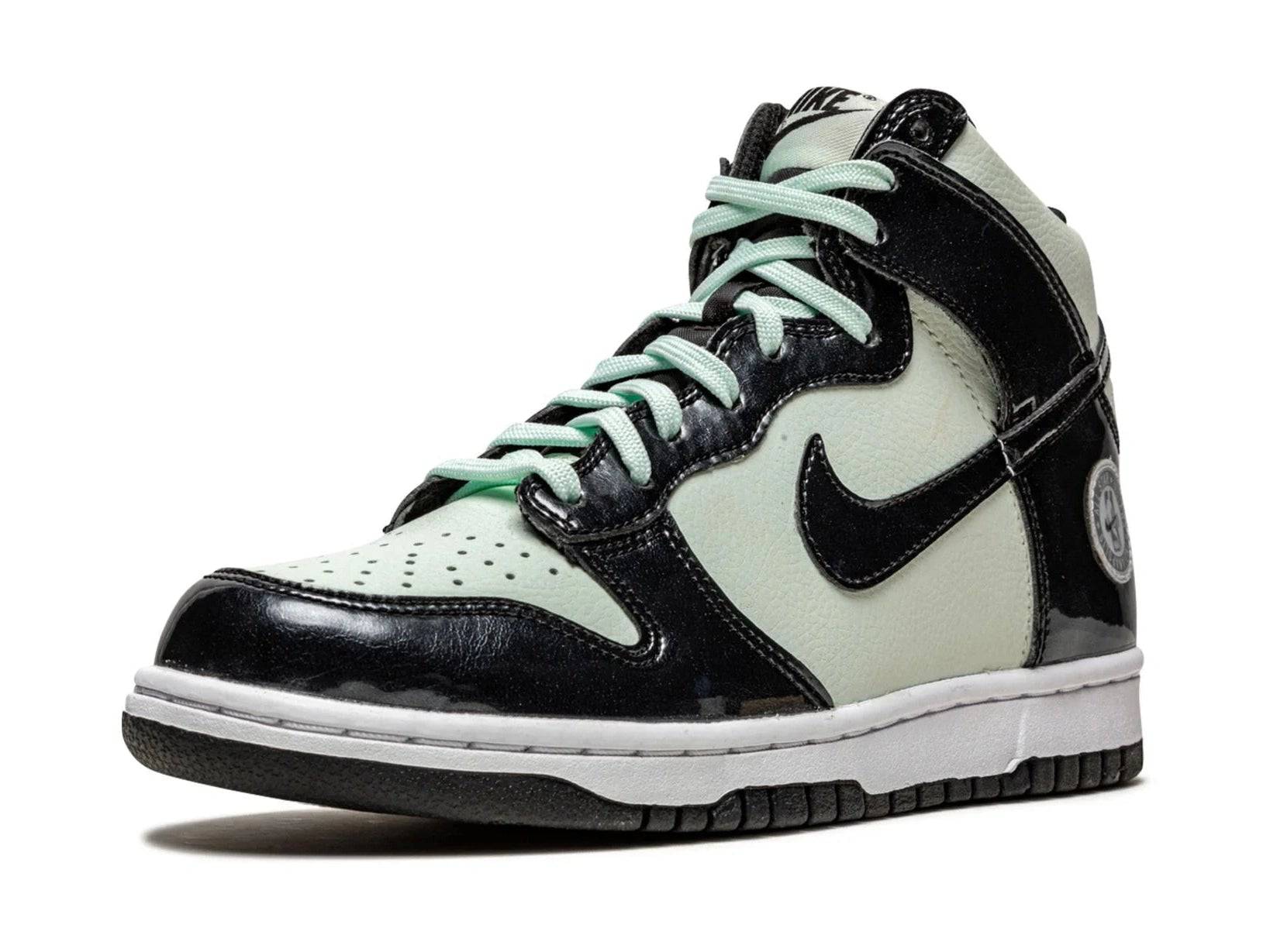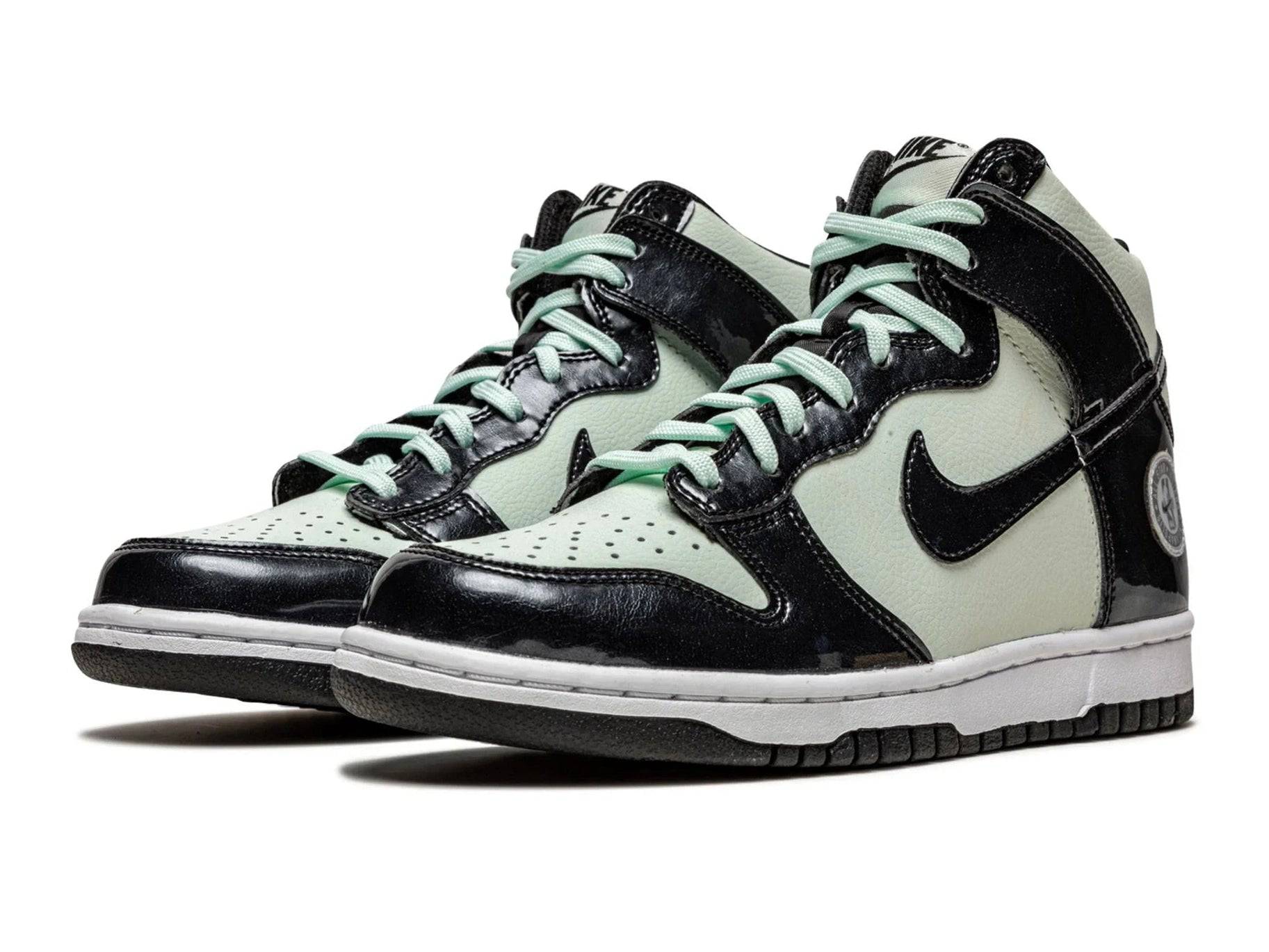 The Nike Dunk High SE All-Star is a true eye-catcher for sneakerheads who love unique details and a bold look. This high-top Dunk mixes pastel green leather with shiny black patent leather overlays for a striking two-tone look that immediately stands out on the streets. The color combination feels fresh and powerful at the same time — perfect for spring or to break up a dark fit.