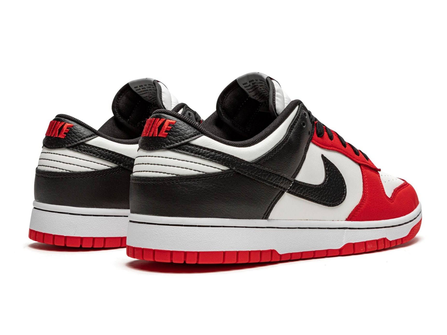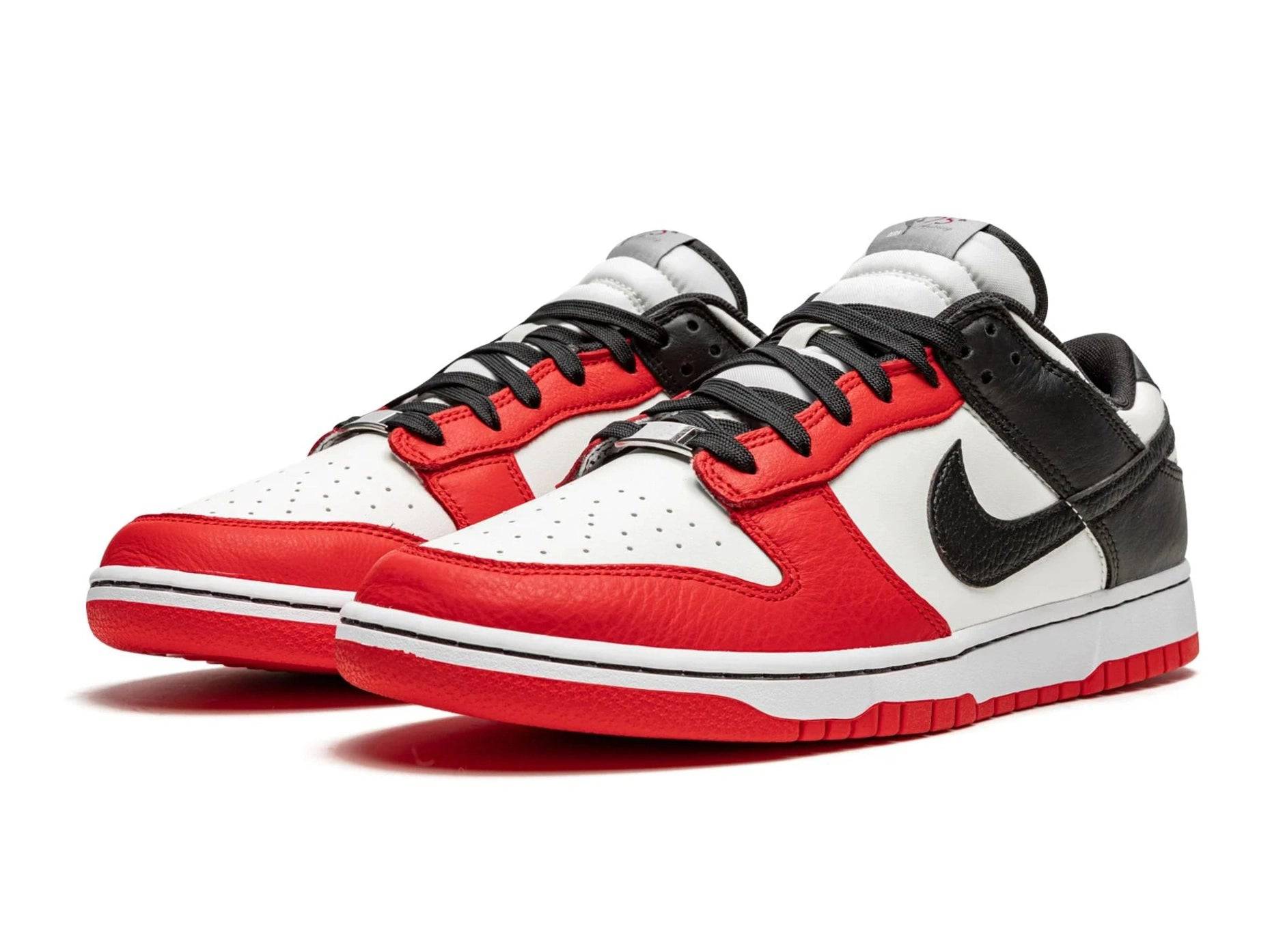 The upper is constructed from premium leather with a balanced colorblock of red, white and black — a direct nod to the classic Chicago uniforms. The subtle grained leather Swoosh and lasered NBA 75th Anniversary tongue label make this pair extra special. This EMB (Embedded) edition breathes a fresh, sporty soul into the famous Dunk Low.