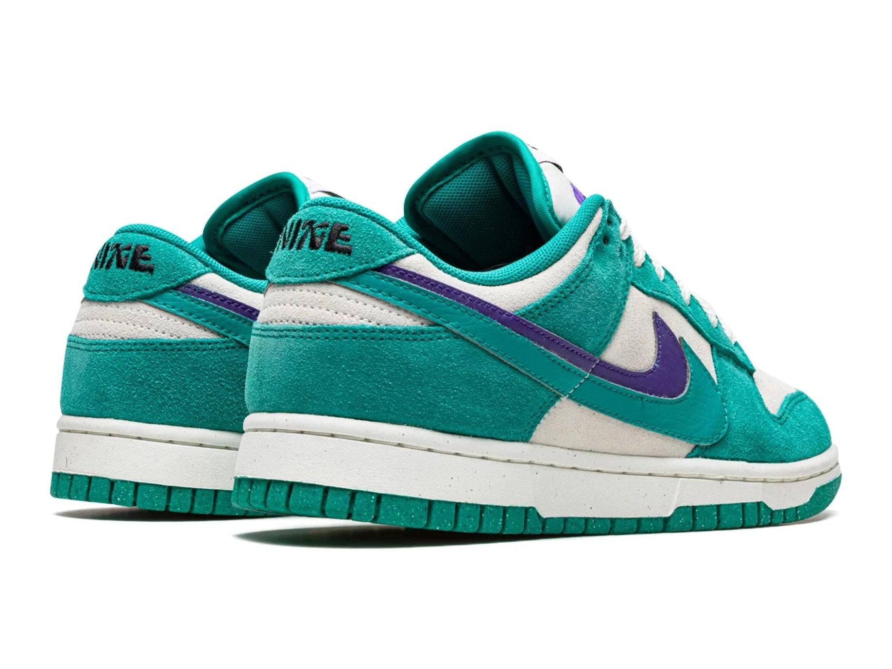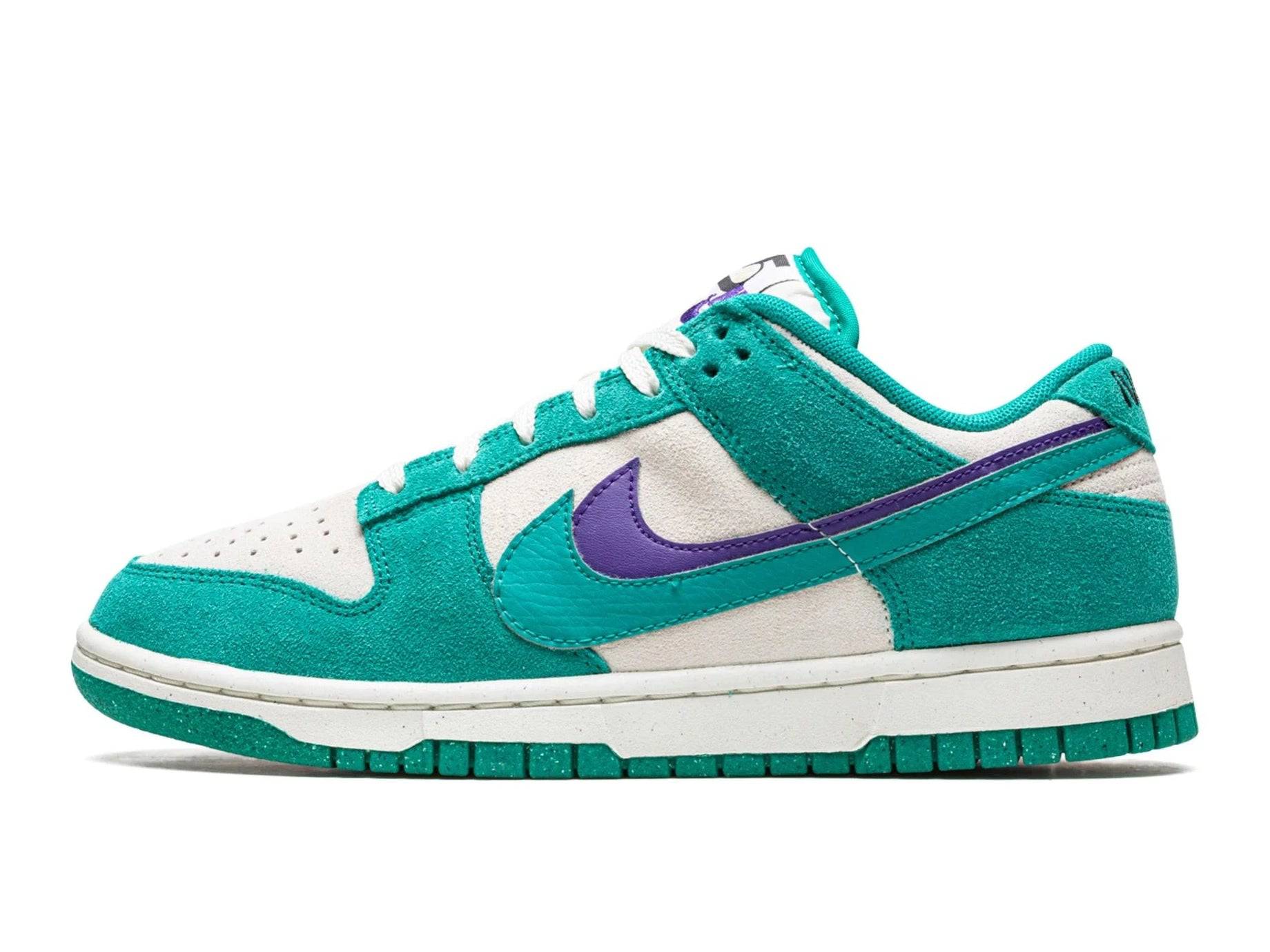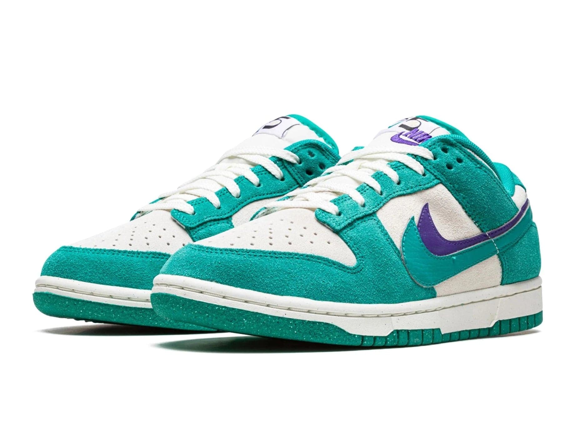 The Nike Dunk Low SE 85 Neptune Green is a fresh throwback to the early days of the Dunk. This pair combines vintage vibes with modern flair: suede overlays in a striking Neptune Green are perfectly contrasted by an off-white leather base and a double Swoosh in turquoise and purple that subtly draws attention.