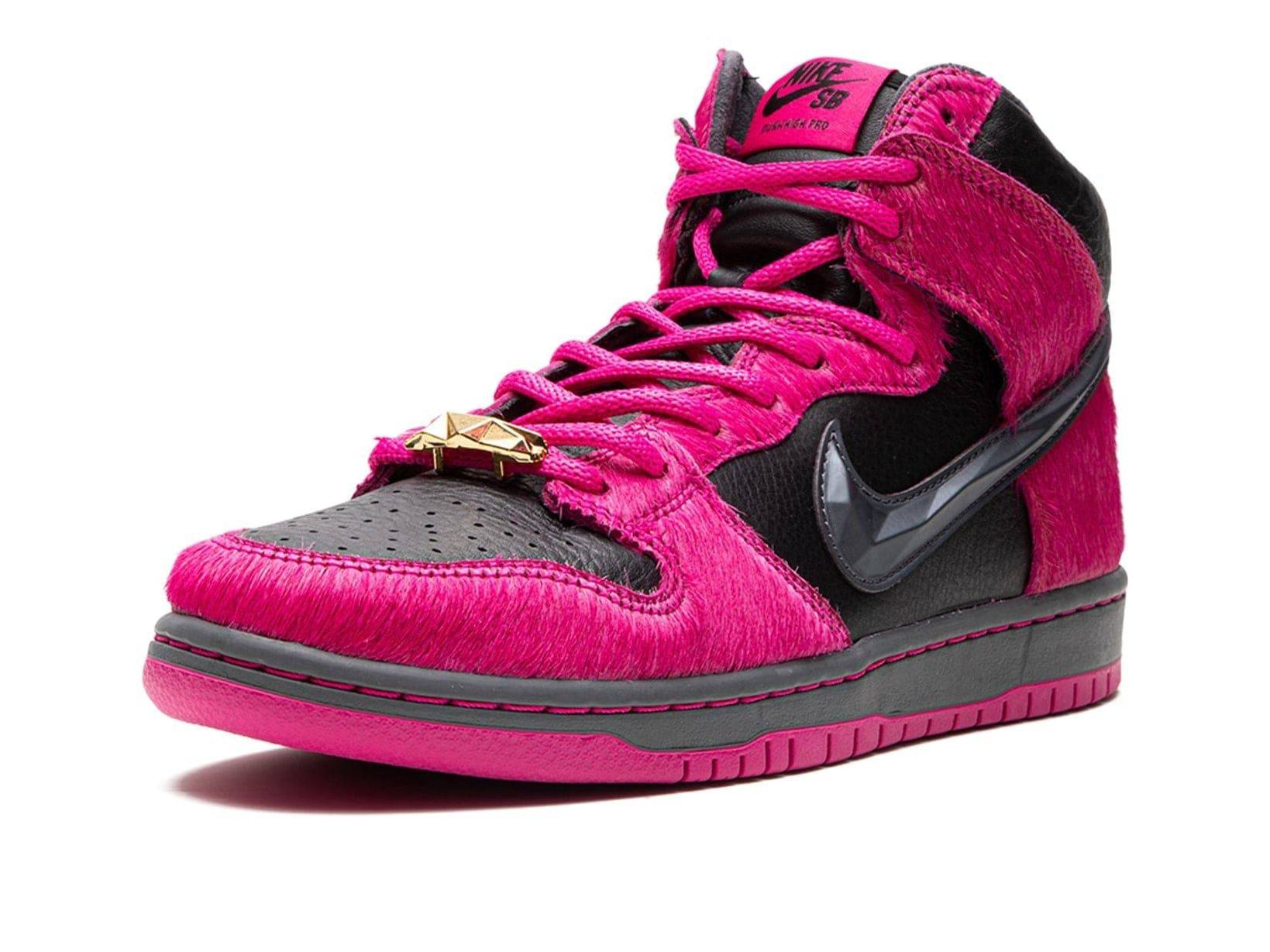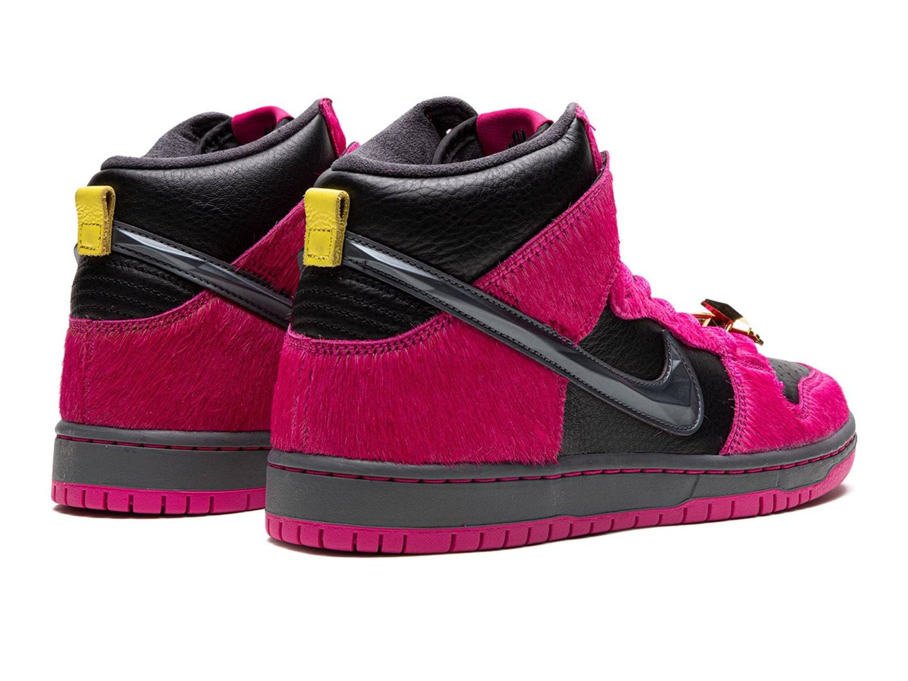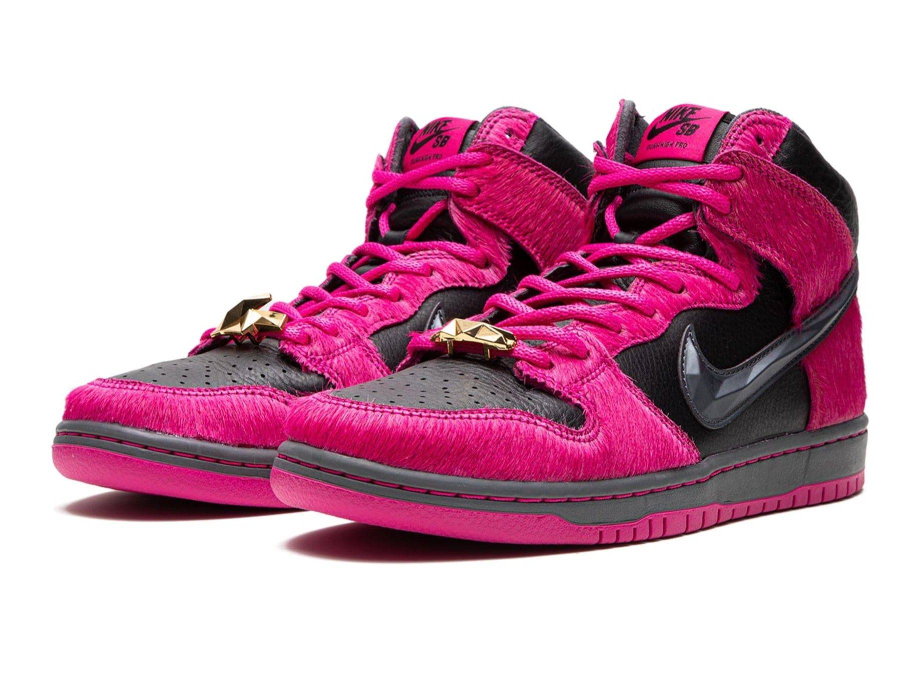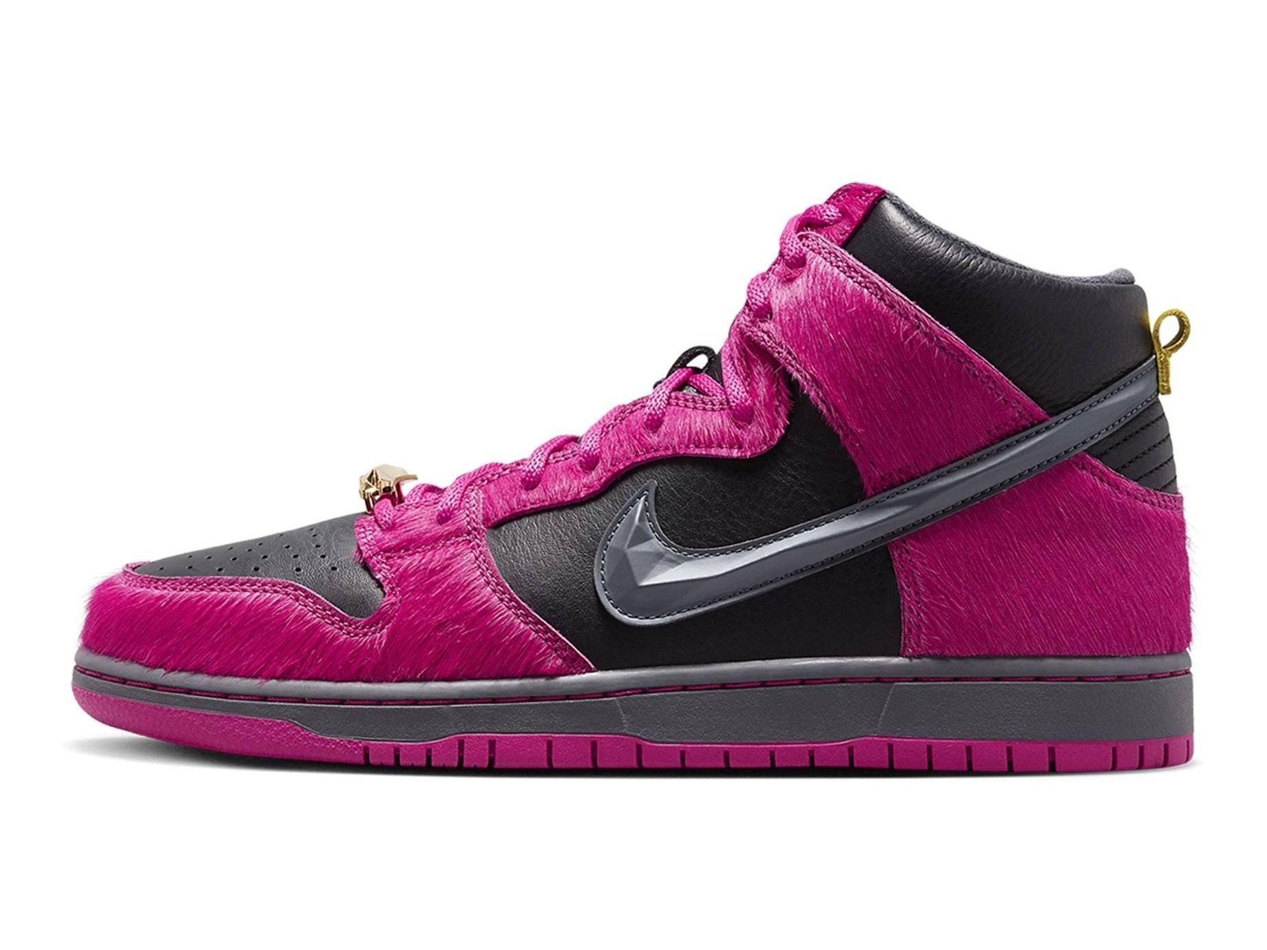 The Nike SB Dunk High Run The Jewels 4/20 is a flamboyant banger for those who dare. With a bold combination of premium black leather and hot pink pony hair, this SB Dunk steals the show like only a Run The Jewels collaboration can. The OG basketball DNA is still palpable, but here it's fully tuned for the streets.